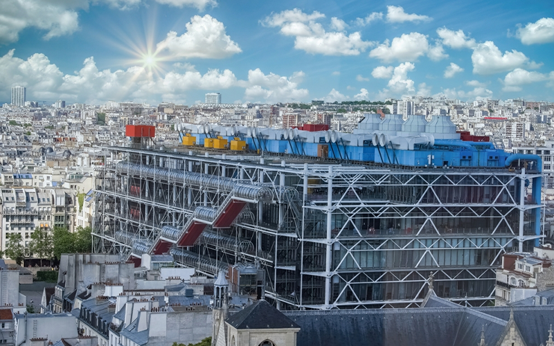Đây là một trong những công trình High-Tech nổi tiếng nhất, do kiến trúc sư Richard Rogers và Renzo Piano thiết kế. Tòa nhà có thiết kế phô bày toàn bộ hệ thống cấu trúc và dịch vụ, biến những ống dẫn, dầm thép trở thành phần trang trí nổi bật.