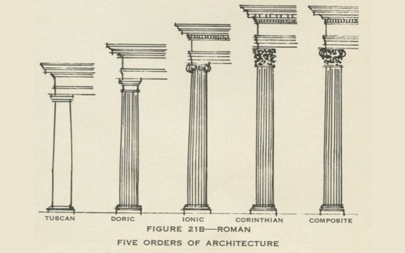 Việc sử dụng các loại cột La Mã như Tuscan, Doris, Ionic, Corinthian và Composite rất phổ biến. Các cột này không chỉ thực hiện chức năng cấu trúc và hỗ trợ, mà còn được sử dụng như một yếu tố trang trí, thể hiện qua cách sử dụng Pilasters.